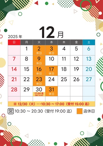 12/2(火)、12/3(水)、12/9(水)、12/16(火)、12/17(水)、12/23(火)、12/31(水)