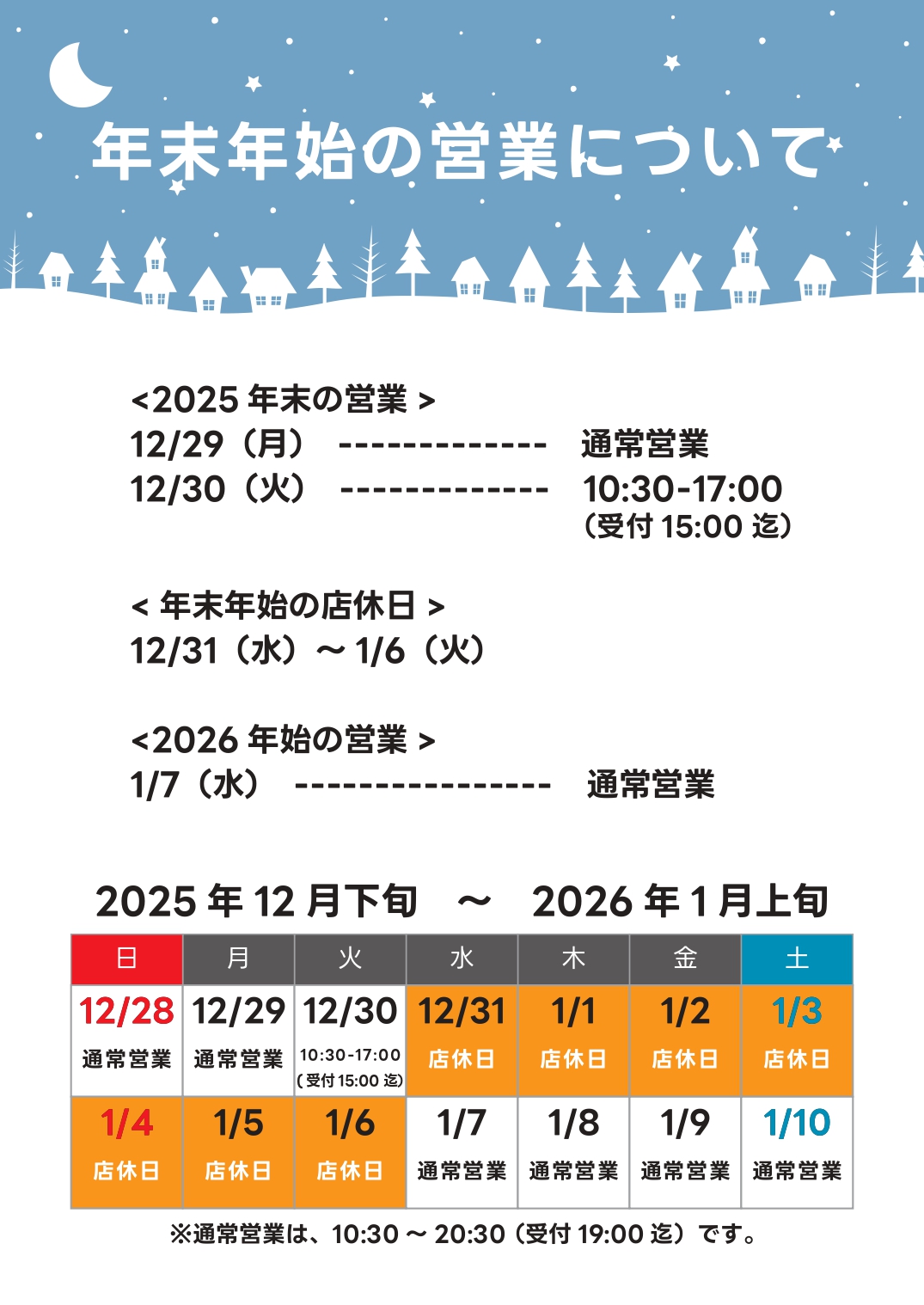 【2025年】 12/29(月) 通常営業 12/30(火) 10:30-17:00(受付 15:00 迄)